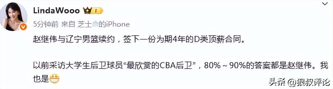 媒体人LindaWooo发文点评:以前采访大学生后卫球员“最欣赏的CBA后卫”,80%~90%的答案都是赵继伟。我也是。